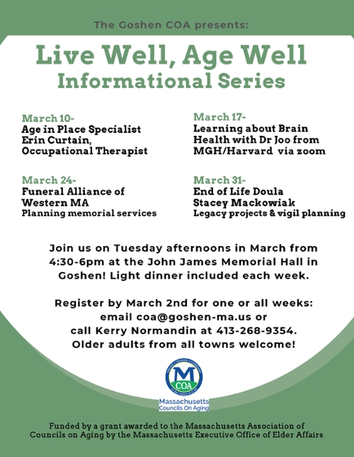 There will be 4 workshops on the last 4 Tuesdays of the month dealing with aging and wellness