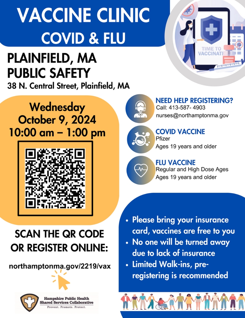 Mark your calendars for a Covid/flu clinic on October 9 th from 10 am to 1 pm at the Plainfield Safety Complex, 38 N. Main Street. Pre-registration is recommended at northamptonma.gov/2219/vax orby calling 413-587-4903. Registering will save time and help the clinic organizers know how many vaccines to bring, however, walk-ins are welcome (please bring your insurance card). Vaccines are free but insurance helps to cover some of the cost. Anyone 19 years of age and older can register.